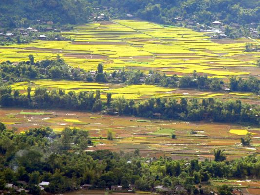 Đứng trên đỉnh đèo ngắm toàn bộ khu vực thung lũng Khau Phạ, xa xa là các bản Lìm Thái, Lìm Mông.